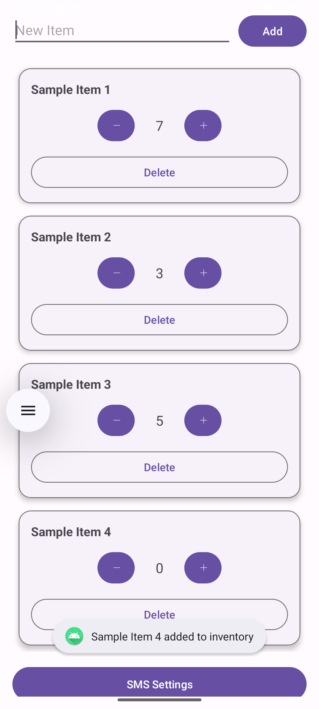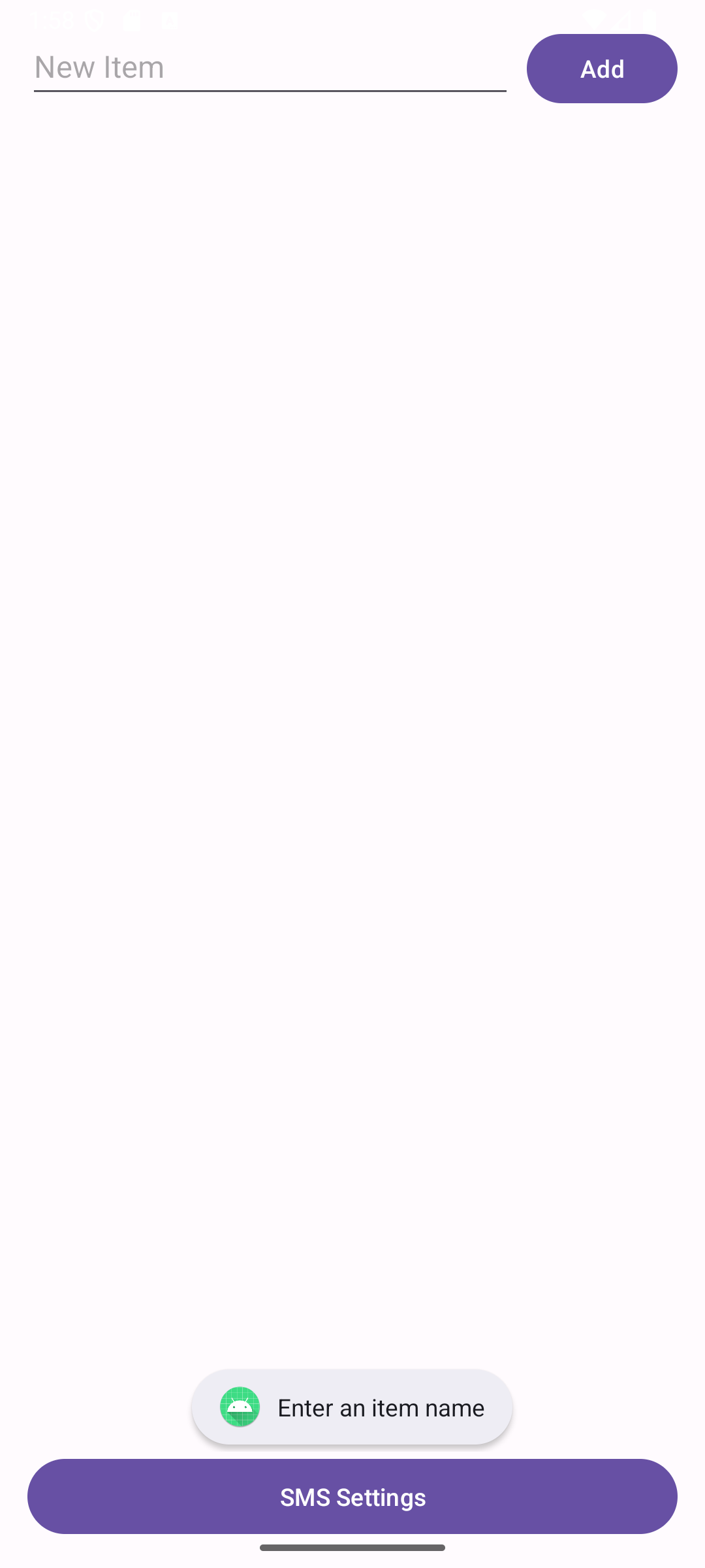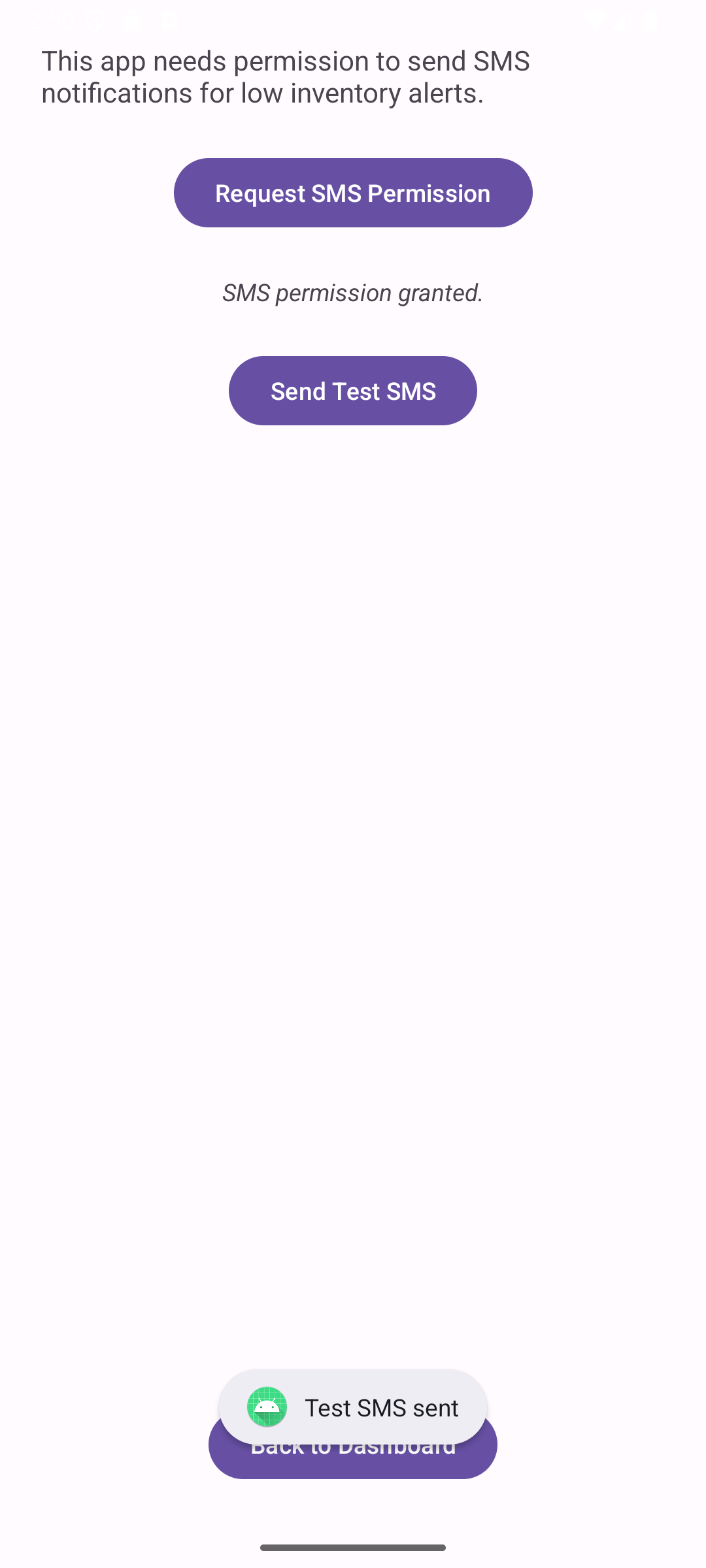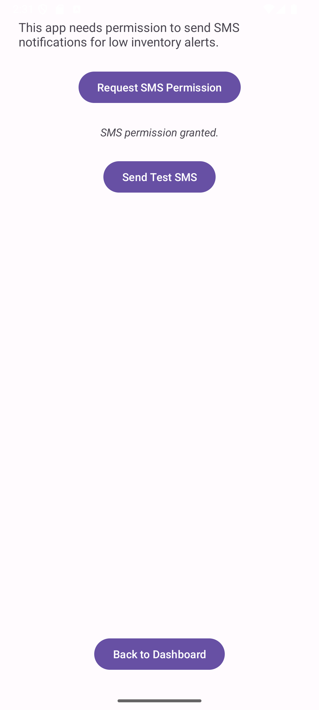 Behind the scenes, the app stores data locally using SQLite, ensuring that items are saved between sessions. A lightweight login system provides secure access, and the optional SMS feature is handled through Android's built-in permissions to keep the app safe and reliable.